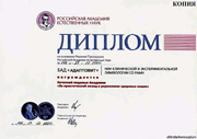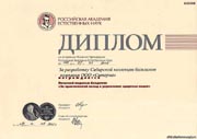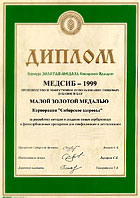 Малая Золотая медаль Сибирской ярмарки выставка «Медсиб-99» за разработку методов и создание новых сорбционных и фитосорбционных препаратов для лимфосанации и детоксикации. 1999 год Новосибирск |