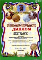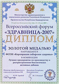 Золотая медаль Форума «Здравница 2007» в номинации «Лучшее предприятие по производству и распространению БАД» |