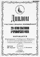 Диплом ярмарки, посвященной 220-летию Севастополя и Черноморского флота за высокое качество продукции и вклад в оздоровление населения г. Севастополя