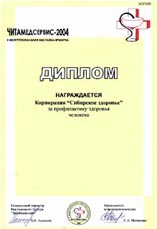 Диплом II Межрегиональной выставки-ярмарки «Читамедсервис-2004» за профилактику здоровья человека.