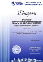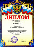 Диплом VIII Всероссийской специализированной выставки «Товары XXI-го века. Волгохозторг» за вклад в оздоровление жителей Нижневолжского региона, Украины и Белоруссии.
