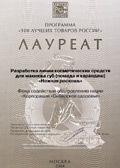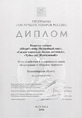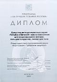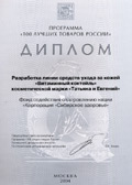 Диплом Всероссийской Программы-конкурса «Сто лучших товаров России» за разработку антицеллюлитных средств серии «Татьяна и Евгений»