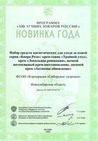 Диплом победителя в номинации «Новинка года» программы «100 лучших товаров Росии» за набор средств косметических для уход за кожей серия «Биора-роза», крем-тоник «Тройной уход», крем «Локальная реновация», ночной интенсивный «Крем-восстановление», дневной крем «Активное обновление»