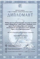 Диплом программы «100 лучших товаров России» за набор средств косметических для ухода за кожей серия «Биора-роза», крем-тоник «Тройной уход», крем «Локальная реновация», ночной интенсивный «Крем-восстановление», дневной крем «Активное обновление»